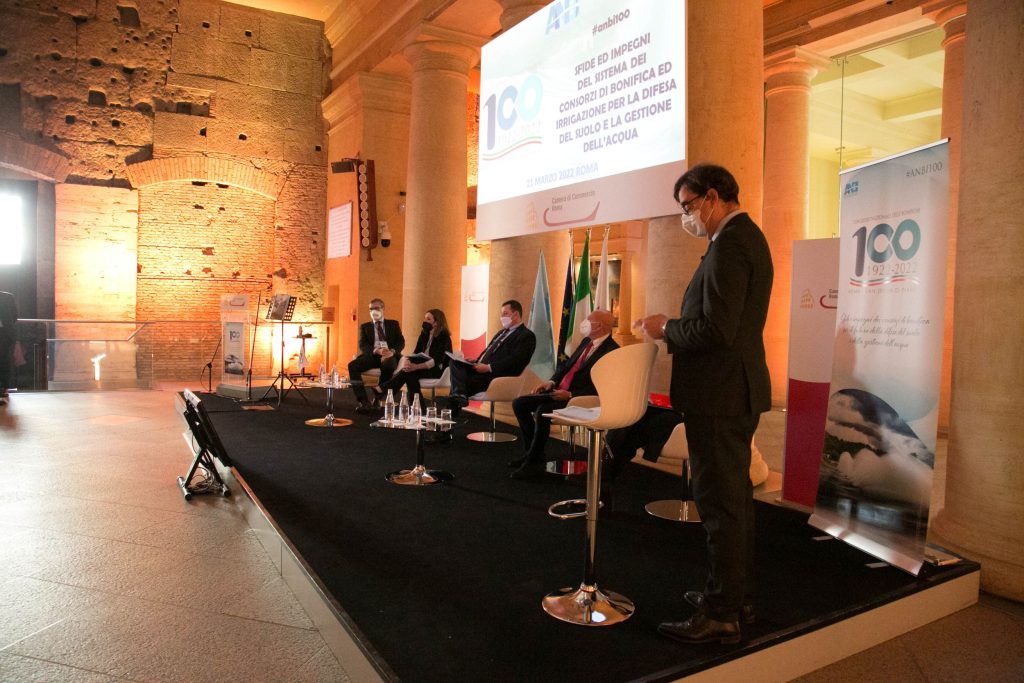 Significativa è la coincidenza del Centenario con l’avvio del Piano Nazionale di Ripresa e Resilienza. Le missioni del P.N.R.R. sono tutte comprese nelle attività, che i Consorzi di bonifica svolgono per la gestione del territorio e nel progetto di valorizzazione del loro patrimonio culturale; declinandoli sul territorio, tali principi si traducono, ad esempio, negli 858 progetti, perlopiù definitivi ed esecutivi, del Piano Nazionale di Efficientamento della Rete Idraulica, finalmente assunta fra le infrastrutture strategiche del Paese, al pari di strade ed aeroporti; il documento di ANBI prevede un investimento complessivo di circa 4 miliardi e 339 milioni di euro, capace di attivare oltre 21.000 posti di lavoro. L’obbiettivo è ristrutturare ed ampliare un reticolo fatto di migliaia di chilometri di alvei e di opere ingegneristiche, reso inadeguato dall’estremizzazione climatica, dove una crescente siccità (ormai soprattutto nel Nord Italia) si alterna ad eventi atmosferici più violenti, nonché concentrati nel tempo e nello spazio. Pur continuando a cadere annualmente circa 300 miliardi di metri cubi di pioggia sulla Penisola, la percentuale di territorio a rischio desertificazione ha raggiunto il 21%, a testimonianza di un andamento pluviometrico “a macchia di leopardo”.