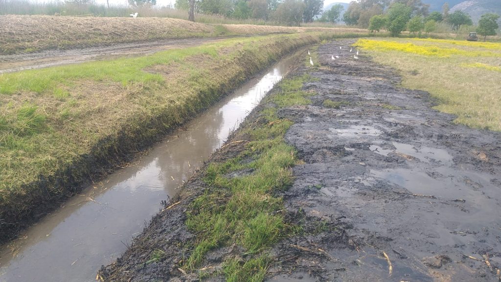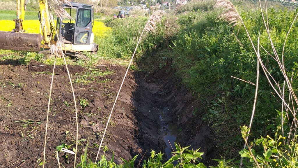 Eseguite le attività di trinciatura della vegetazione sulla sommità arginale e spondale con trattore gommato e fase di riescavo del fondo dell’alveo per asportare i detriti trasportati dalla corrente eseguita con escavatore cingolato con benna.