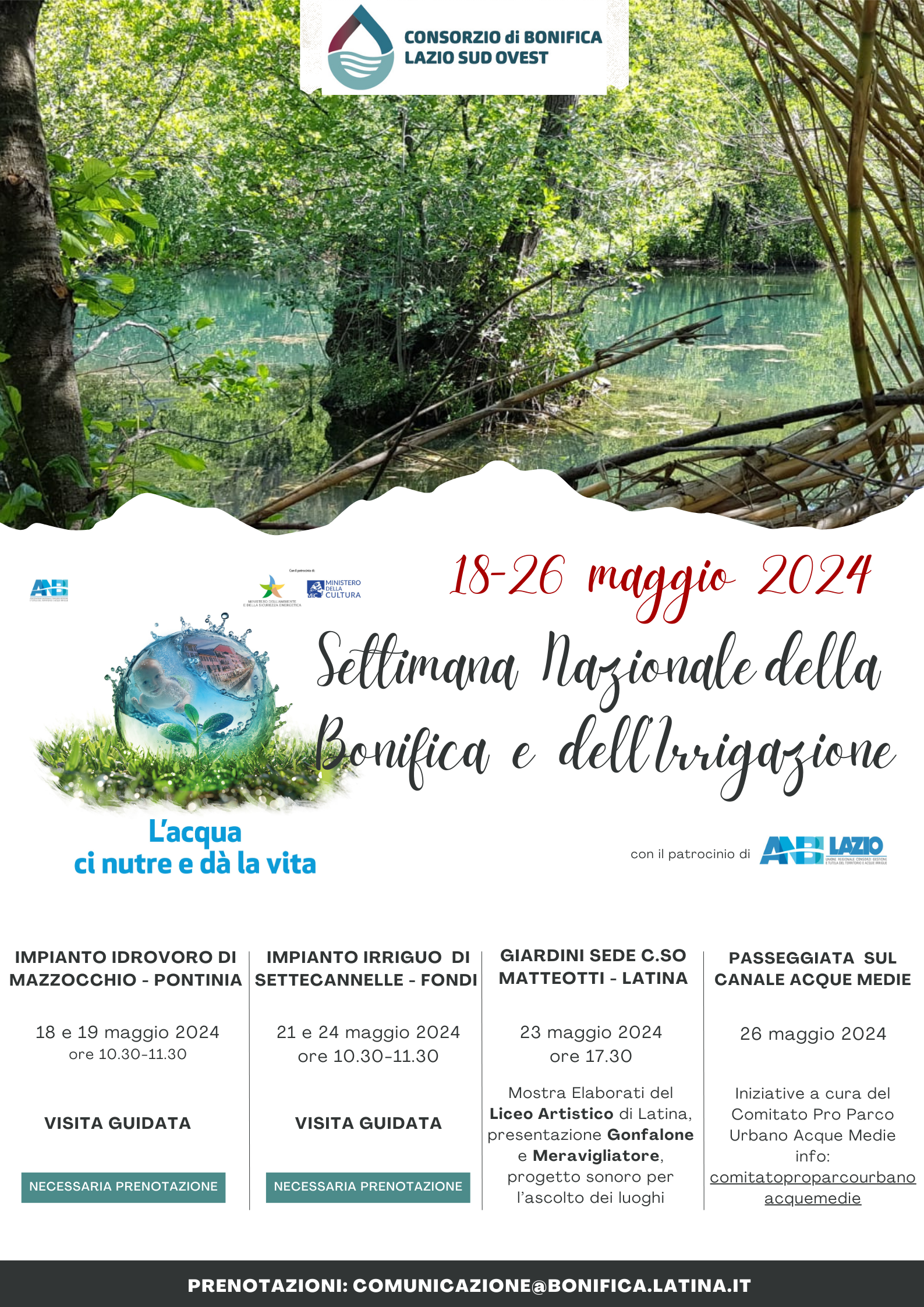 In occasione della Settimana Nazionale della Bonifica e dell’Irrigazione, che si terrà dal 18 al 26 maggio 2024, il Consorzio organizza le seguenti iniziative: